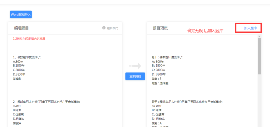 2)在智能导入页面,点击页面“Word智能导入”按钮,选择已经准备好的Word文档上传。
